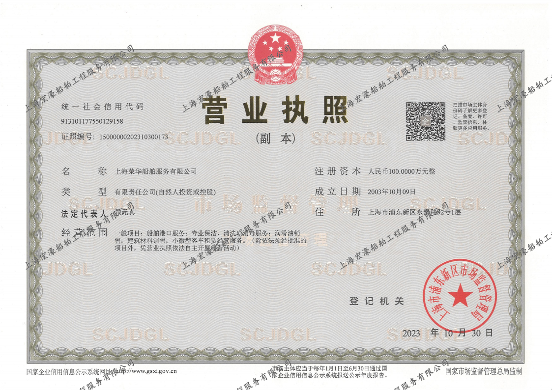 上海荣华船舶服务有限公司是经国家主管机关批准认可在上海港从事船舶污染清除作业和船舶污染物接收、油舱清洗、围油栏布设的专业公司。按船舶污染物清除三级资质单位配备了防污染设备、器材和人员。是上海市海事局认可的水上船舶污染物接收转运单位,上海市环境局备案的“船舶污染物”上岸转移单位。