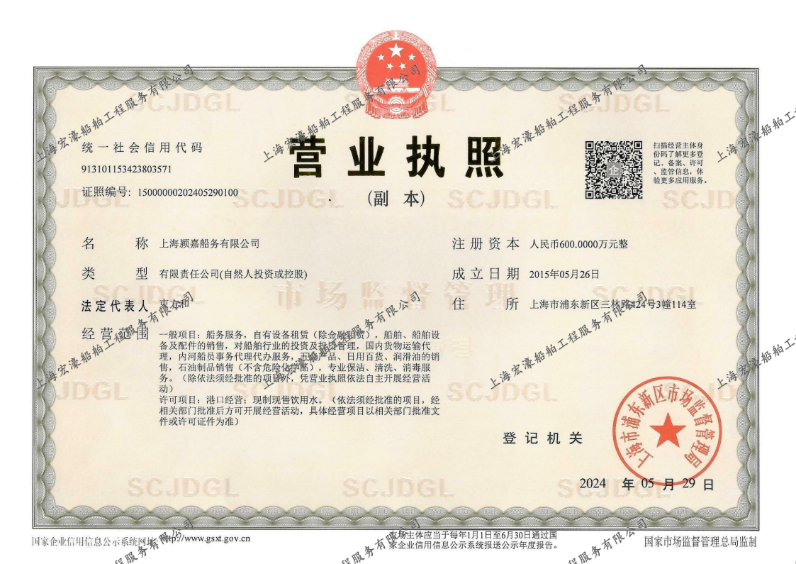 上海颍嘉船务有限公司是经上海海事局备案认可,上海市交通委员会核发的《港口经营许可证》,主要为停靠上海港船舶提供残油、油污水接收、生活垃圾接收和船舶清舱,以及围油栏布设、污染事故应急防备和应急处置服务的专业公司,按船舶污染物清除三级资质单位配备有防污染设备、器材和人员。