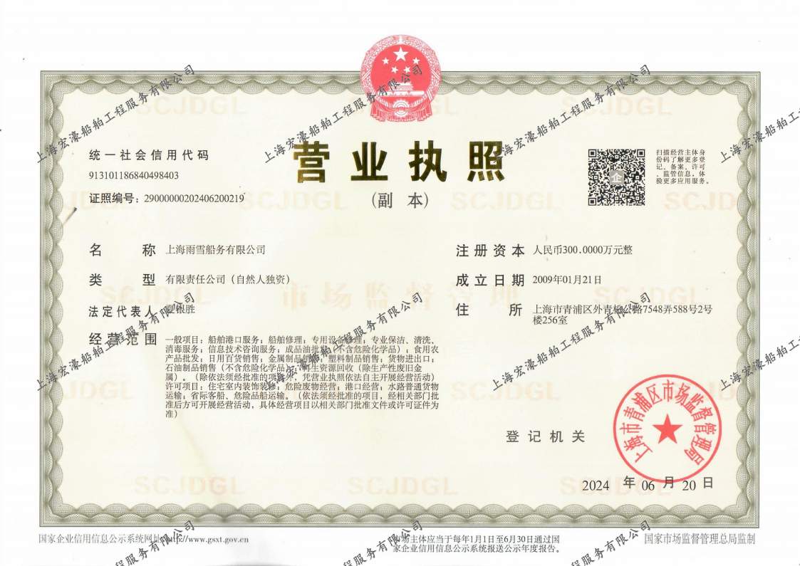 上海雨雪船务有限公司 2009 年经国家工商行政管理部门核准注册登记,并取得港口行政管理部门核发的《港口经营许可证》,以及海事部门评估核发的专业清(洗)舱资质证书和供油资质许可证。是一家专业从事船舶清舱、船舶残油及油污水接收,船舶燃油供应以及船舶生活垃圾接收业务为一体的船舶服务类企业,按船舶污染物清除三级资质单位配备了防污染设备、器材和人员。