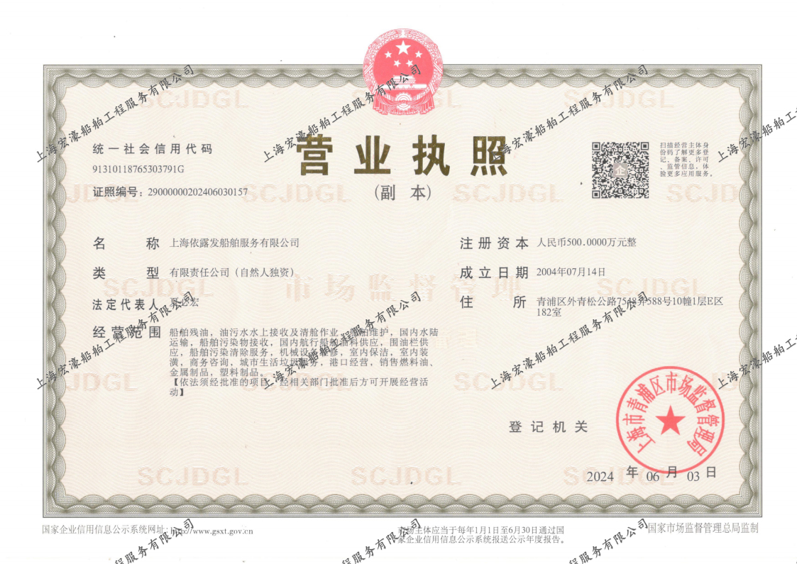 上海依露发船舶服务有限公司(SHANGHAI YILUFA MARINE SERVICES CO.,LTD.)成立于2004年,目前注册资金为人民币500万元,在上海港从事船舶残油油污水接收,船舶清舱及港口应急服务等业务。公司持有上海市交通委员会核发的《港口经营许可证》,在上海海事局备案的船舶残油、油污水及清舱资质,拥有专业的管理团队,经验丰富、能吃苦耐劳的船员、油污水接收和清舱队伍,建立了各项安全生产管理制度,具有良好的港口协调能力。